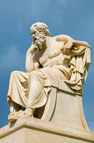 소크라테스는 덕은 인간에 내재한다고 믿고 사람들에게 이를 깨닫게 하기 위해 온갖 계층의 사람들과 대화를 나눔으로써 사람들에게 자신의 무지함을 일깨워 주고 용기나 정의 등에 관한 윤리상의 개념을 설교하고 다녔습니다. 그는 대화를 통해 누군가를 가르치지 않고 질문을 함으로써 자신에게 무엇이 잘못인지 깨닫게 해주었죠.